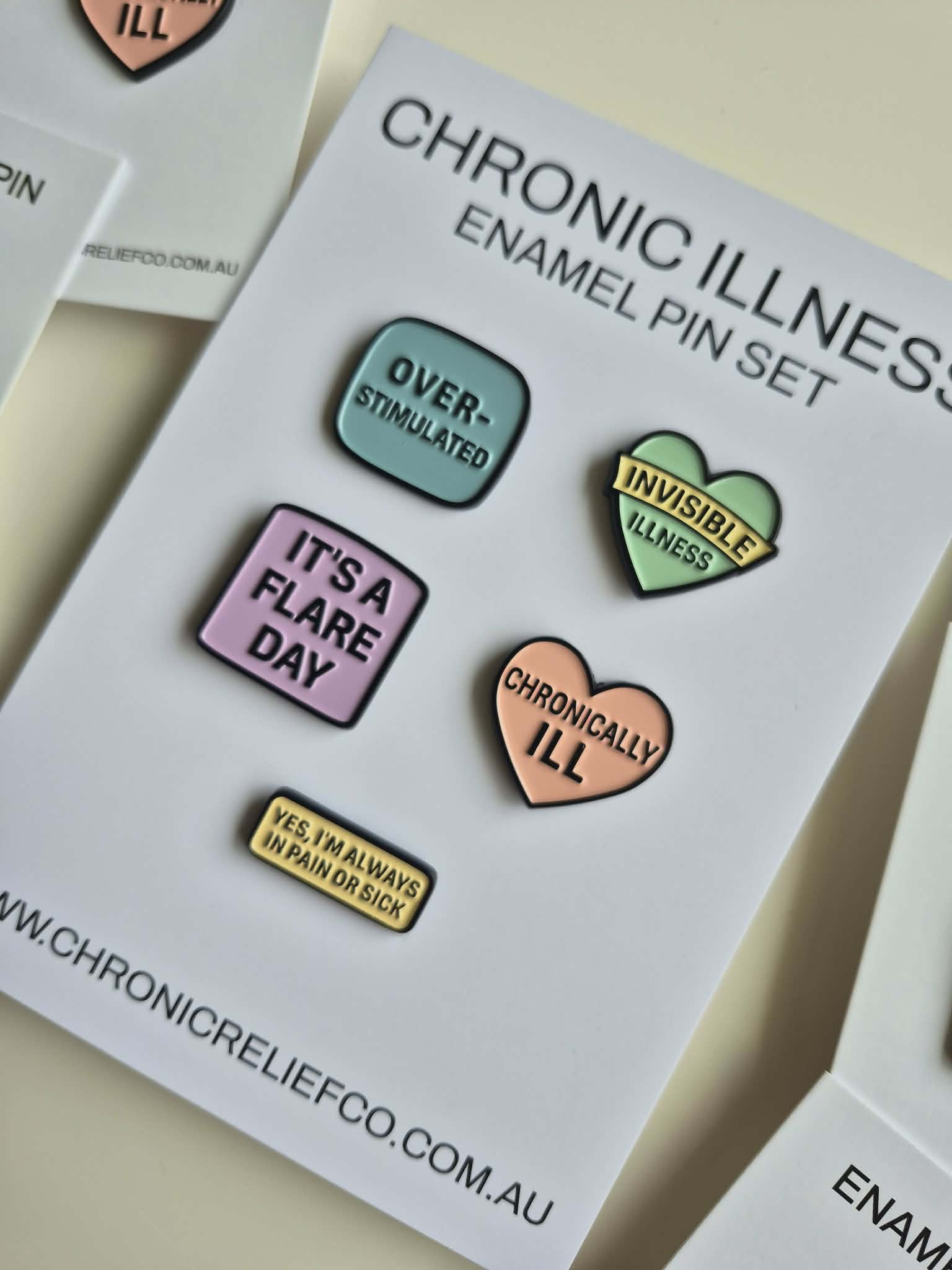 Each pin reflects a feeling many of us experience daily — from flare days to overstimulation — and is designed in soft, calming colours with a clean, minimalist look.